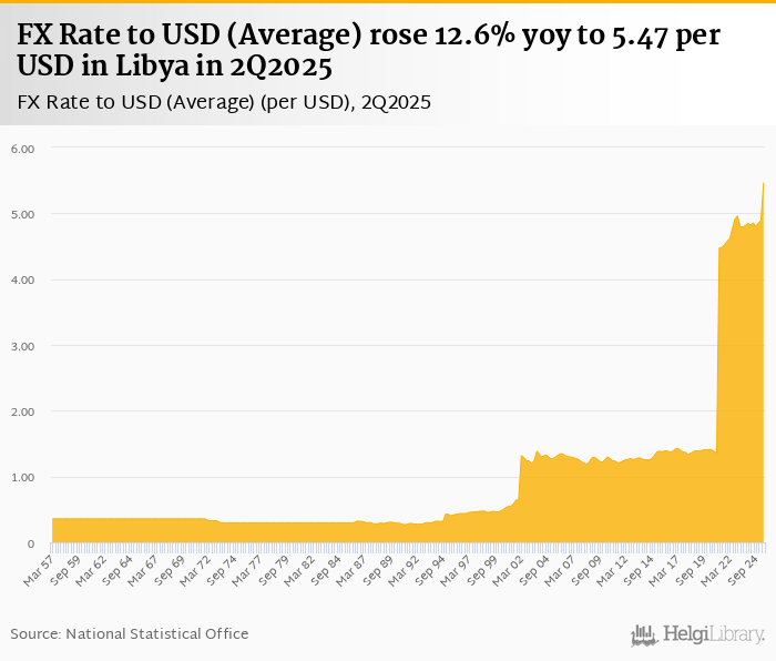 Average FX rate to USD rose 12.6% yoy to 5.47 per USD in Libya in 2Q2025, according to the National Statistical Office. This is 11.8% more than in the previous quarter.