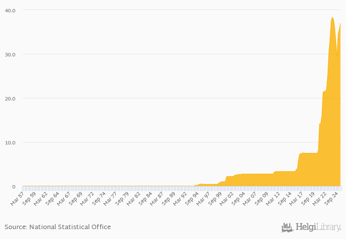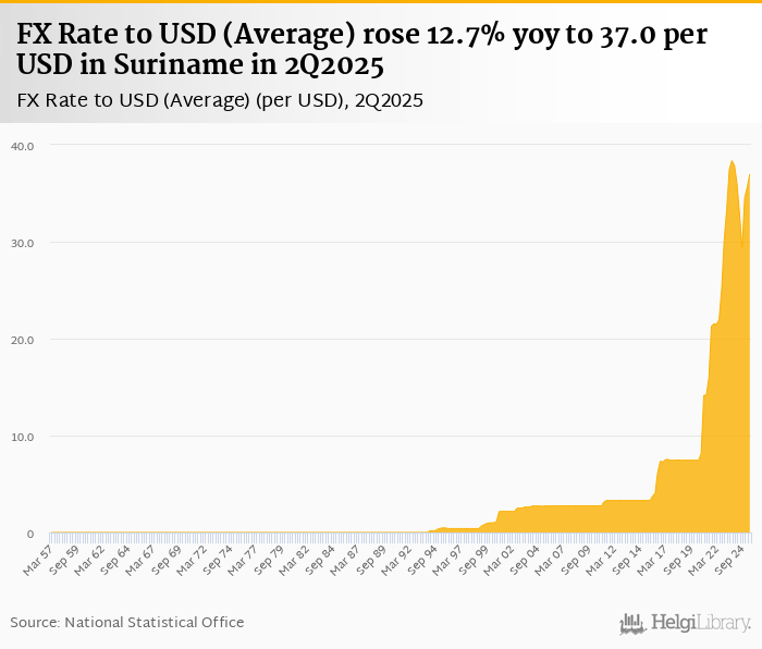 Average FX rate to USD rose 12.7% yoy to 37.0 per USD in Suriname in 2Q2025, according to the National Statistical Office. This is 3.69% more than in the previous quarter.