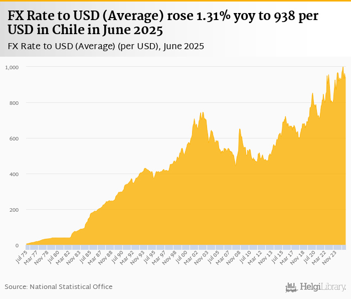 Average FX rate to USD rose 1.31% yoy to 938 per USD in Chile in June 2025, according to the National Statistical Office. This is 0.347% less than in the previous month.