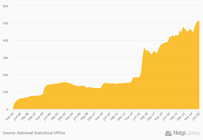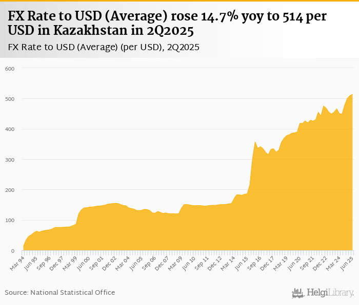 Average FX rate to USD rose 14.7% yoy to 514 per USD in Kazakhstan in 2Q2025, according to the National Statistical Office. This is 0.814% more than in the previous quarter.