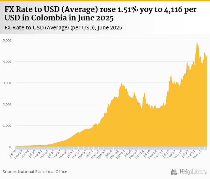 Average FX rate to USD rose 1.51% yoy to 4,116 per USD in Colombia in June 2025, according to the National Statistical Office. This is 2.06% less than in the previous month.