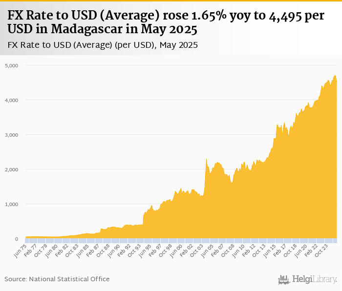 Average FX rate to USD rose 1.65% yoy to 4,495 per USD in Madagascar in May 2025, according to the National Statistical Office. This is 1.50% less than in the previous month.