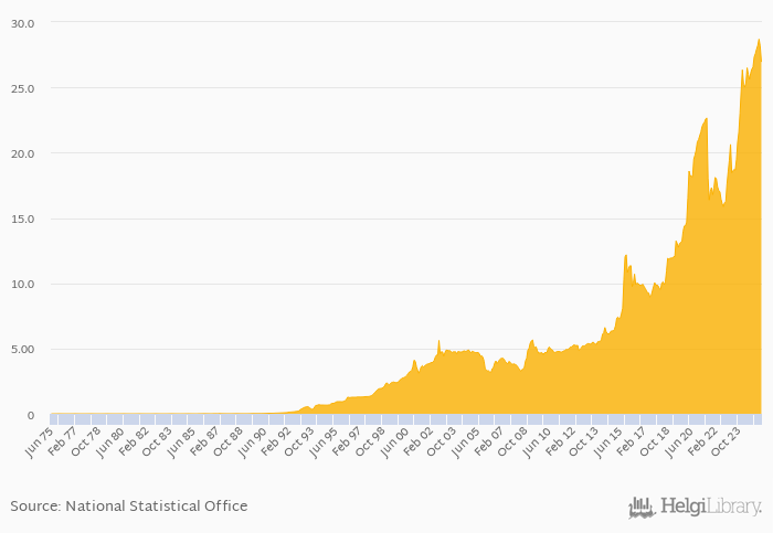 Historically, Average FX rate to USD in Zambia reached an all time high of 28.7 per USD in March 2025 and an all time low of < 0.001 per USD in January 1976.