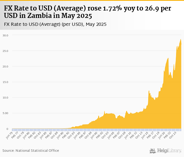 Average FX rate to USD rose 1.72% yoy to 26.9 per USD in Zambia in May 2025, according to the National Statistical Office. This is 4.28% less than in the previous month.