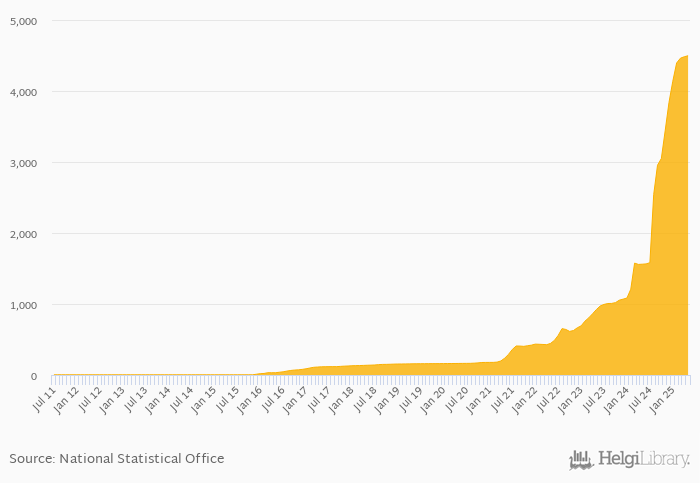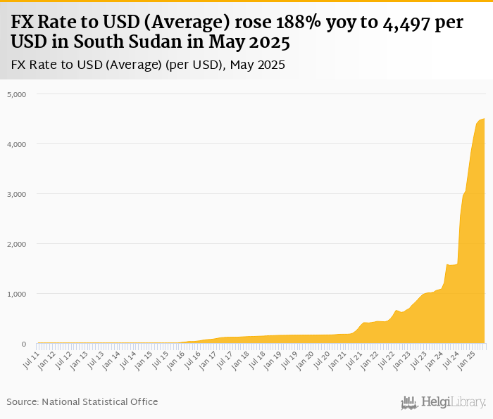 Average FX rate to USD rose 188% yoy to 4,497 per USD in South Sudan in May 2025, according to the National Statistical Office. This is 0.317% more than in the previous month.