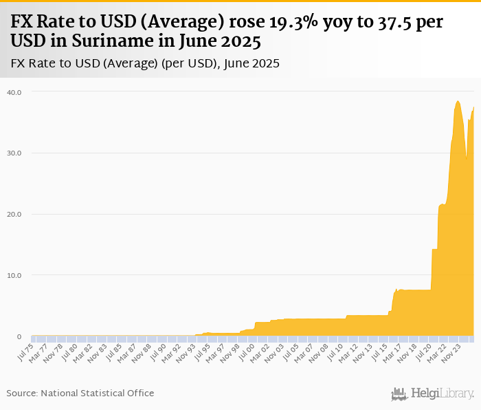 Average FX rate to USD rose 19.3% yoy to 37.5 per USD in Suriname in June 2025, according to the National Statistical Office. This is 2.43% more than in the previous month.