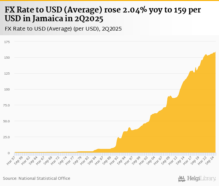 Average FX rate to USD rose 2.04% yoy to 159 per USD in Jamaica in 2Q2025, according to the National Statistical Office. This is 1.17% more than in the previous quarter.