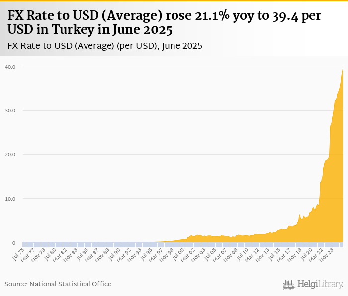 Average FX rate to USD rose 21.1% yoy to 39.4 per USD in Turkey in June 2025, according to the National Statistical Office. This is 1.73% more than in the previous month.