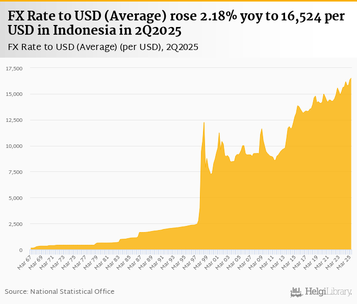 Average FX rate to USD rose 2.18% yoy to 16,524 per USD in Indonesia in 2Q2025, according to the National Statistical Office. This is 1.05% more than in the previous quarter.