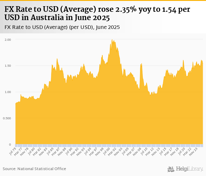 Average FX rate to USD rose 2.35% yoy to 1.54 per USD in Australia in June 2025, according to the National Statistical Office. This is 0.822% less than in the previous month.
