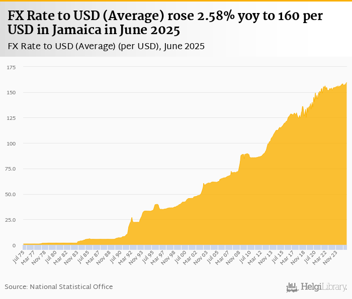 Average FX rate to USD rose 2.58% yoy to 160 per USD in Jamaica in June 2025, according to the National Statistical Office. This is 0.456% more than in the previous month.