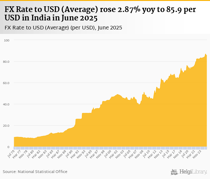 Average FX rate to USD rose 2.87% yoy to 85.9 per USD in India in June 2025, according to the National Statistical Office. This is 0.791% more than in the previous month.