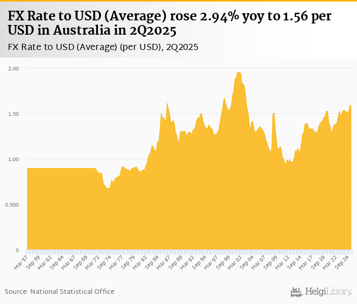 Average FX rate to USD rose 2.94% yoy to 1.56 per USD in Australia in 2Q2025, according to the National Statistical Office. This is 2.04% less than in the previous quarter.
