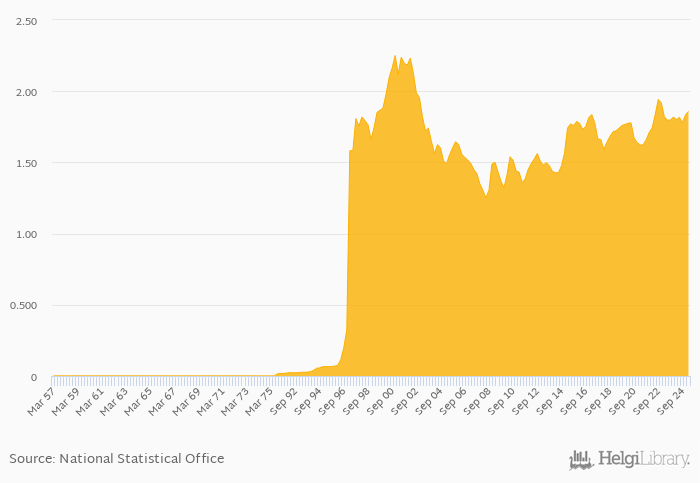 Historically, Average FX rate to USD in Bulgaria reached an all time high of 2.25 per USD in 4Q2000 and an all time low of < 0.001 per USD in 3Q1973. When compared to Bulgaria's main peers, Average FX rate to USD in Greece amounted to 0.950 per USD, 4.73 per USD in Romania, 111 per USD in Serbia and 36.2 per USD in Turkey in 1Q2025.
