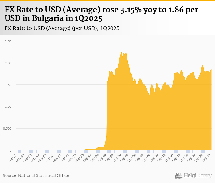 Average FX rate to USD rose 3.15% yoy to 1.86 per USD in Bulgaria in 1Q2025, according to the National Statistical Office. This is 1.36% more than in the previous quarter.