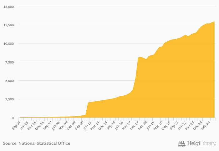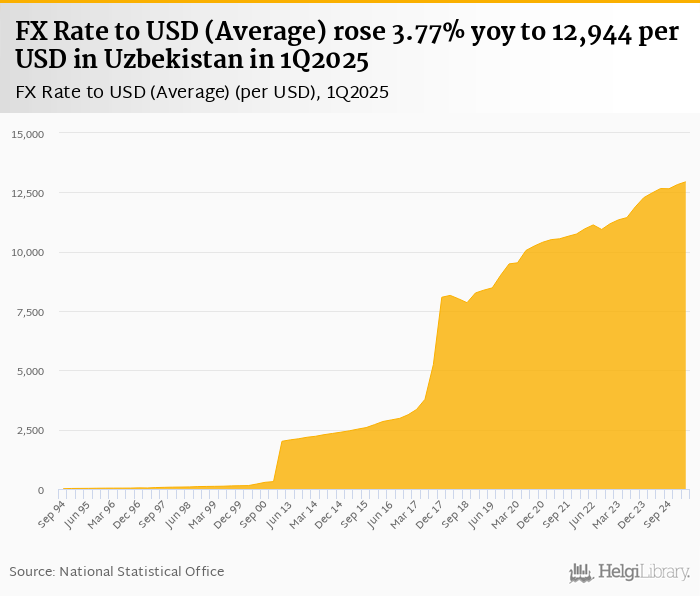 Average FX rate to USD rose 3.77% yoy to 12,944 per USD in Uzbekistan in 1Q2025, according to the National Statistical Office. This is 0.932% more than in the previous quarter.