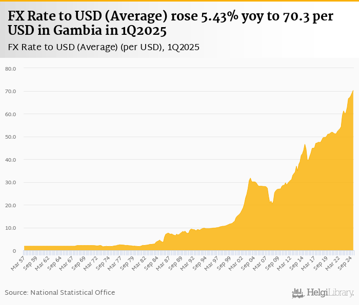 Average FX rate to USD rose 5.43% yoy to 70.3 per USD in Gambia in 1Q2025, according to the National Statistical Office. This is 1.65% more than in the previous quarter.