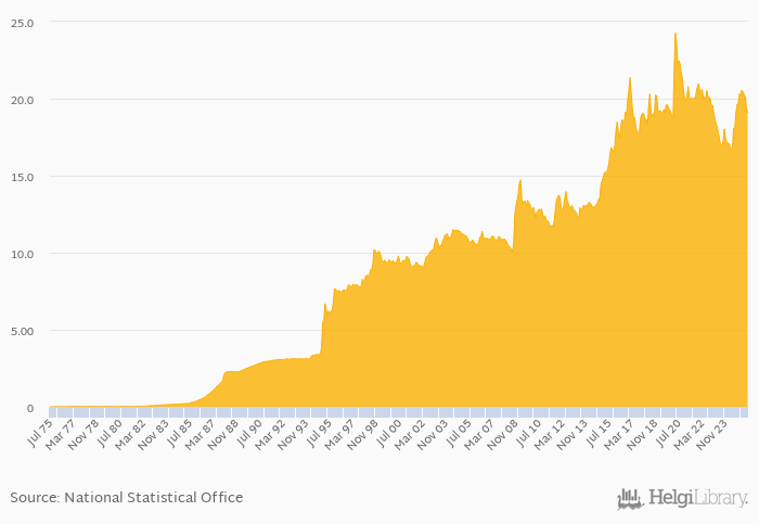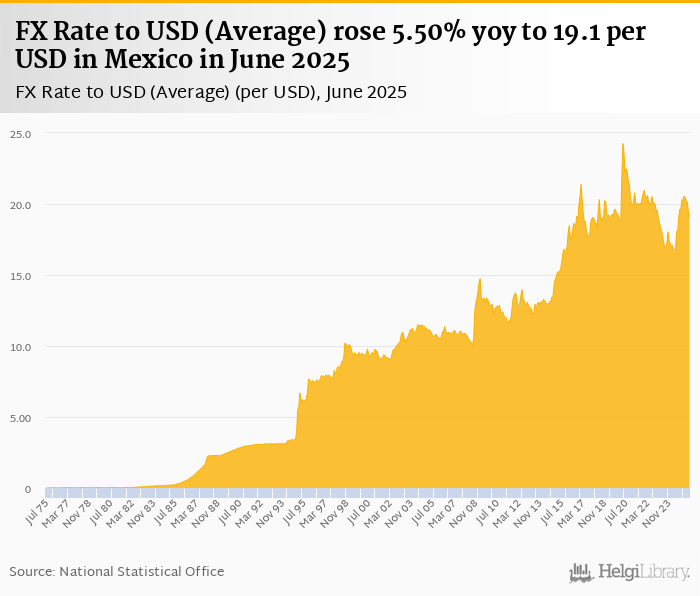Average FX rate to USD rose 5.50% yoy to 19.1 per USD in Mexico in June 2025, according to the National Statistical Office. This is 1.95% less than in the previous month.