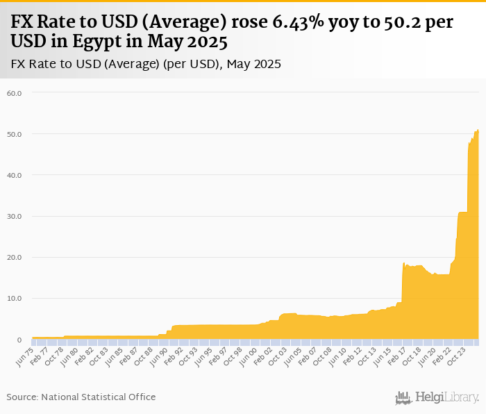 Average FX rate to USD rose 6.43% yoy to 50.2 per USD in Egypt in May 2025, according to the National Statistical Office. This is 1.68% less than in the previous month.