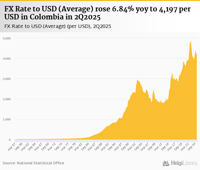 Average FX rate to USD rose 6.84% yoy to 4,197 per USD in Colombia in 2Q2025, according to the National Statistical Office. This is 0.209% more than in the previous quarter.