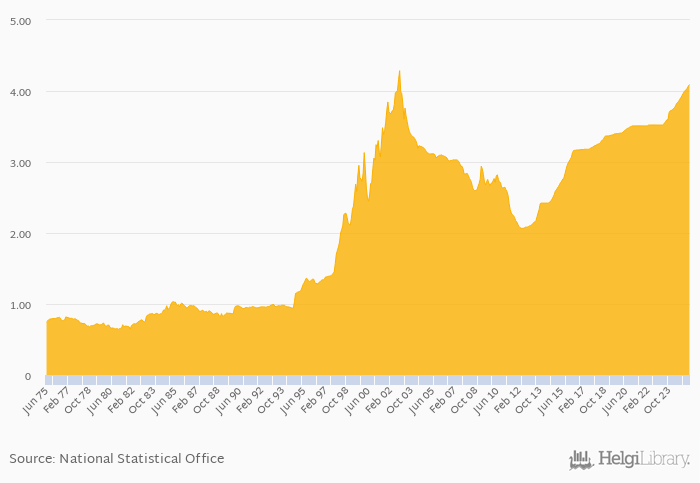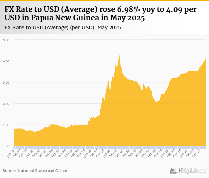 Average FX rate to USD rose 6.98% yoy to 4.09 per USD in Papua New Guinea in May 2025, according to the National Statistical Office. This is 0.524% more than in the previous month.