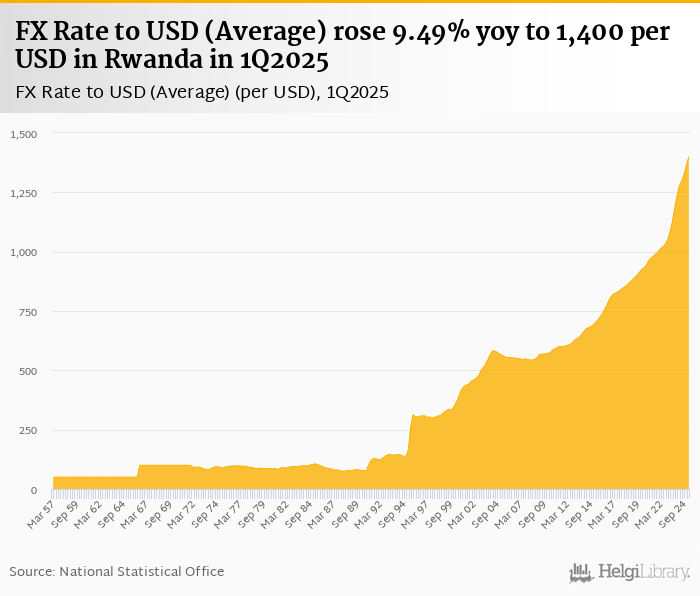 Average FX rate to USD rose 9.49% yoy to 1,400 per USD in Rwanda in 1Q2025, according to the National Statistical Office. This is 2.43% more than in the previous quarter.