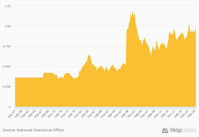 Historically, FX rate to USD at the end of period in Cyprus reached an all time high of 1.18 per USD in 2Q2001 and an all time low of 0.339 per USD in 2Q1973.