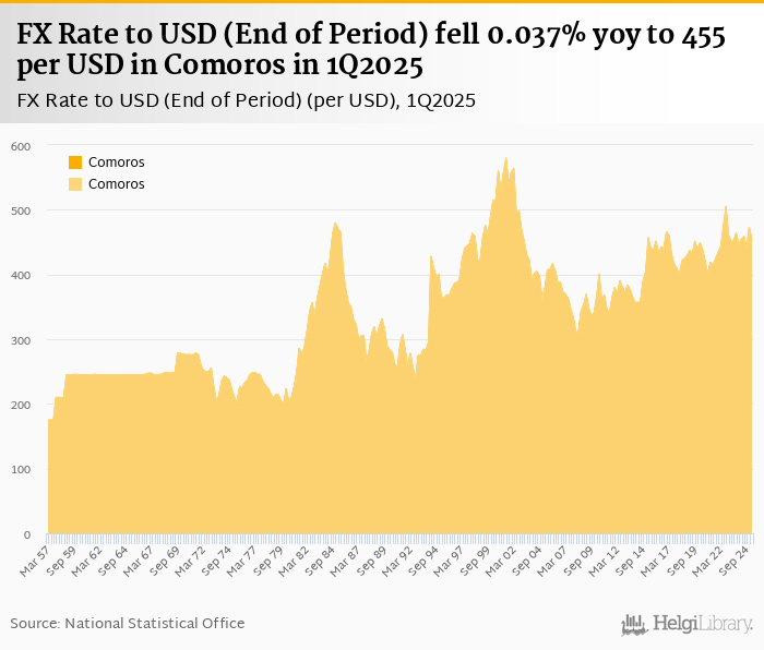 FX Rate to USD (End of Period) fell 0.037% yoy to 455 per USD in Comoros in 1Q2025