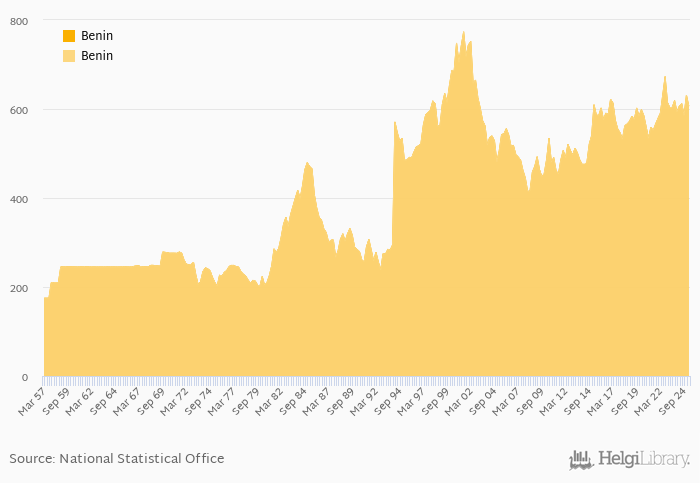 FX rate to USD at the end of period fell 0.037% yoy to 607 per USD in Benin in 1Q2025, according to the National Statistical Office. This is 3.94% less than in the previous quarter.