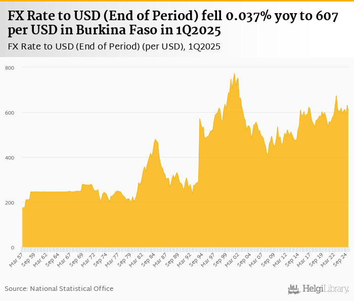 FX rate to USD at the end of period fell 0.037% yoy to 607 per USD in Burkina Faso in 1Q2025, according to the National Statistical Office. This is 3.94% less than in the previous quarter.