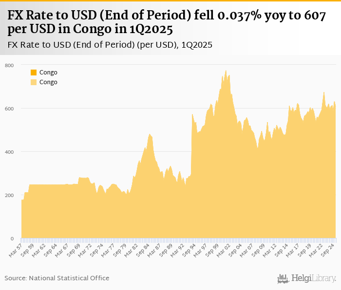 FX rate to USD at the end of period fell 0.037% yoy to 607 per USD in Congo in 1Q2025, according to the National Statistical Office. This is 3.94% less than in the previous quarter.