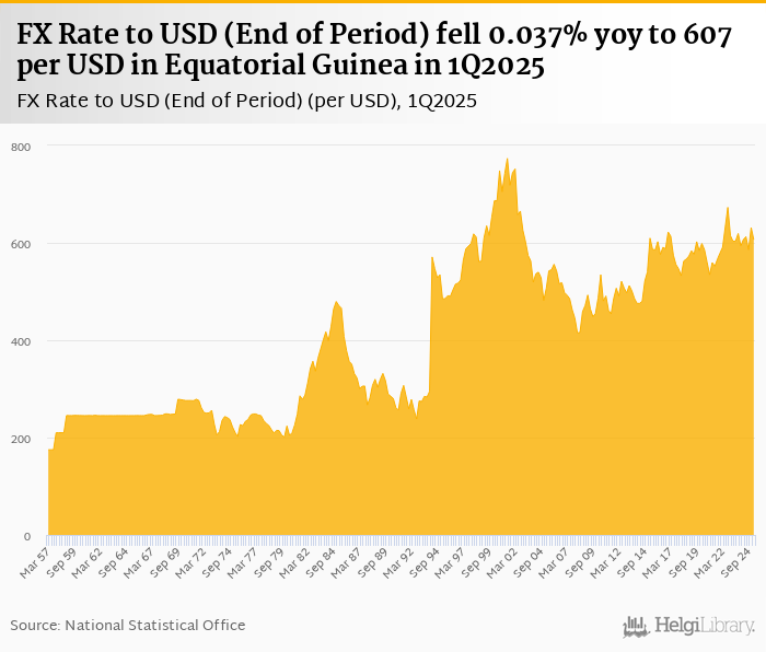 FX Rate to USD (End of Period) fell 0.037% yoy to 607 per USD in Equatorial Guinea in 1Q2025