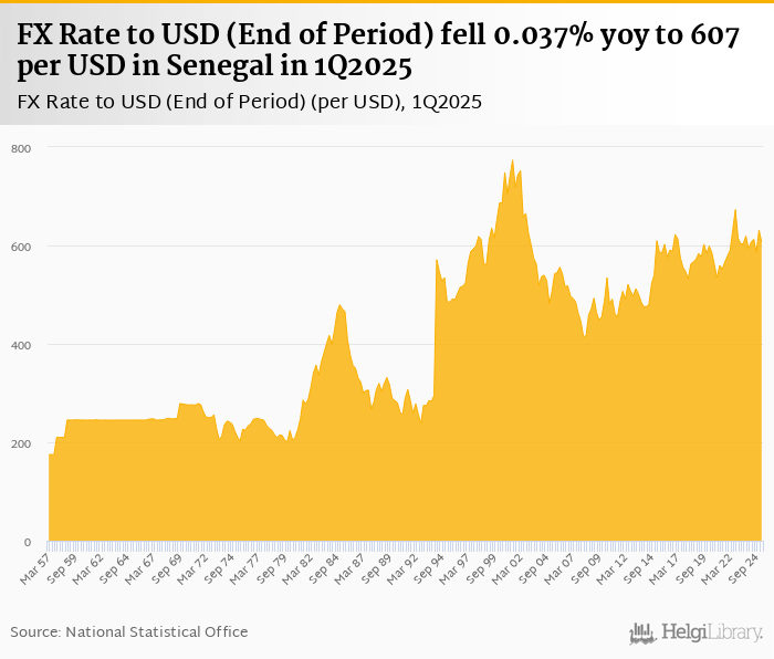 FX rate to USD at the end of period fell 0.037% yoy to 607 per USD in Senegal in 1Q2025, according to the National Statistical Office. This is 3.94% less than in the previous quarter.