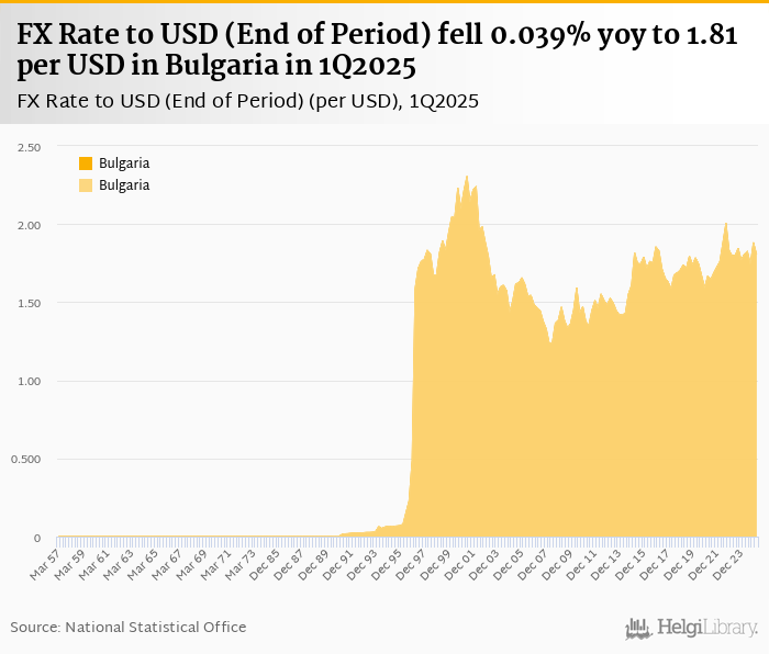 FX rate to USD at the end of period fell 0.039% yoy to 1.81 per USD in Bulgaria in 1Q2025, according to the National Statistical Office. This is 3.94% less than in the previous quarter.