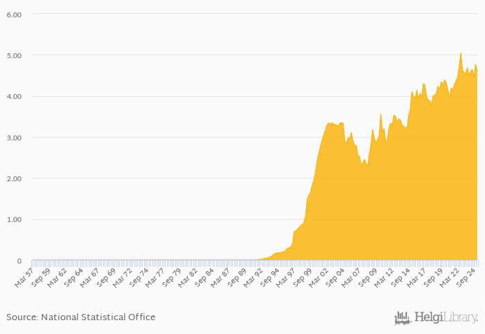 Historically, FX rate to USD at the end of period in Romania reached an all time high of 5.05 per USD in 3Q2022 and an all time low of < 0.001 per USD in 4Q1972. When compared to Romania's main peers, FX rate to USD at the end of period in Bulgaria amounted to 1.81 per USD, 371 per USD in Hungary, 18.0 per USD in Moldova and 41.5 per USD in Ukraine in 1Q2025.