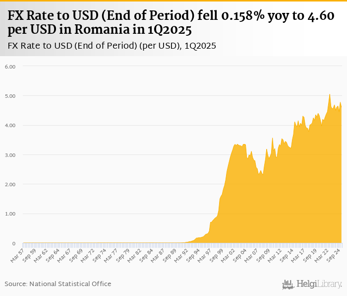 FX Rate to USD (End of Period) fell 0.158% yoy to 4.60 per USD in Romania in 1Q2025