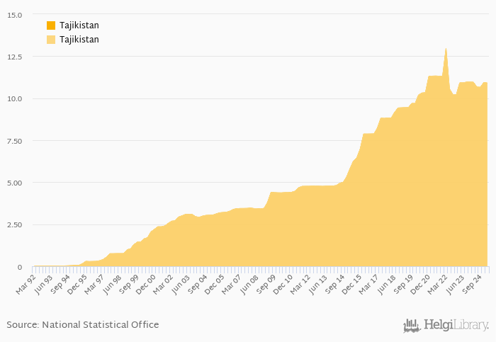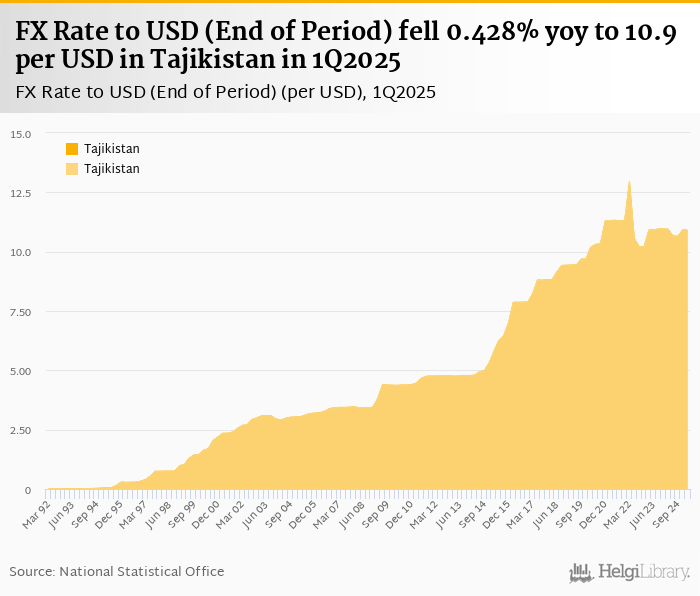 FX rate to USD at the end of period fell 0.428% yoy to 10.9 per USD in Tajikistan in 1Q2025, according to the National Statistical Office. This is 0.259% less than in the previous quarter.