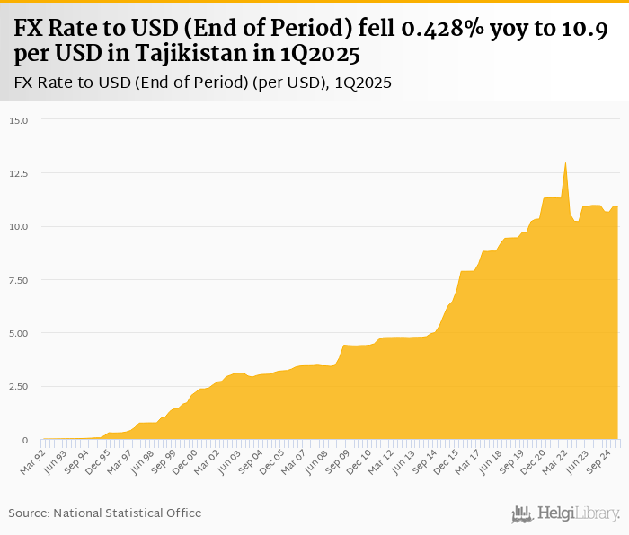 FX Rate to USD (End of Period) fell 0.428% yoy to 10.9 per USD in Tajikistan in 1Q2025