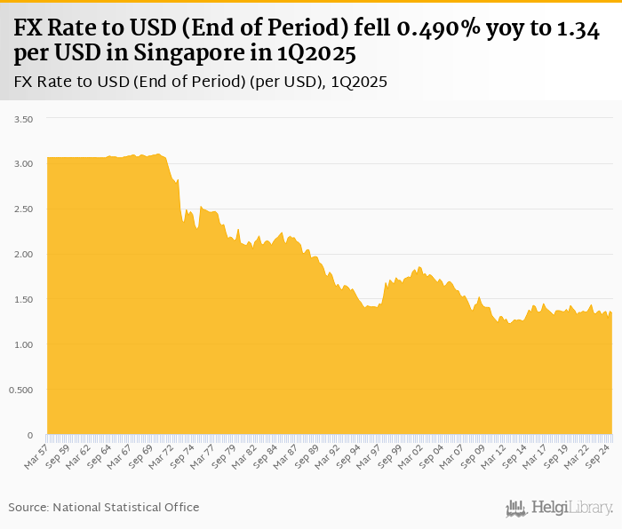 FX rate to USD at the end of period fell 0.490% yoy to 1.34 per USD in Singapore in 1Q2025, according to the National Statistical Office. This is 1.42% less than in the previous quarter.