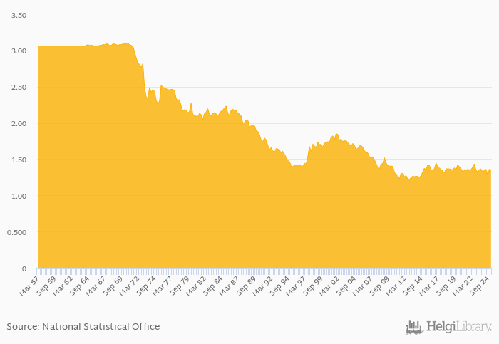 FX rate to USD at the end of period fell 0.490% yoy to 1.34 per USD in Singapore in 1Q2025, according to the National Statistical Office. This is 1.42% less than in the previous quarter.