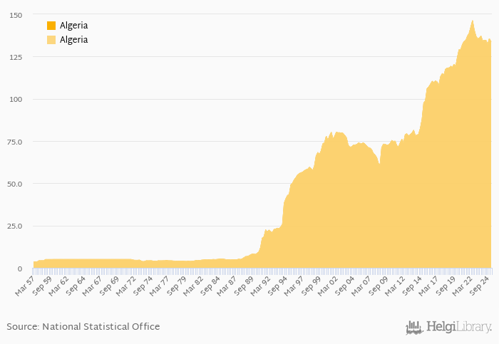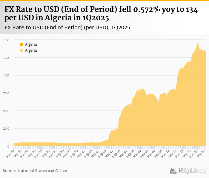 FX Rate to USD (End of Period) fell 0.572% yoy to 134 per USD in Algeria in 1Q2025