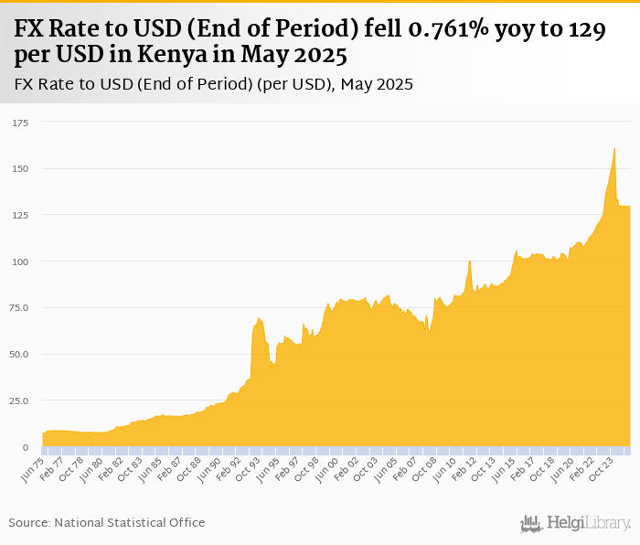FX rate to USD at the end of period fell 0.761% yoy to 129 per USD in Kenya in May 2025, according to the National Statistical Office. This is 0.200% less than in the previous month.