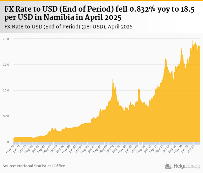 FX rate to USD at the end of period fell 0.832% yoy to 18.5 per USD in Namibia in April 2025, according to the National Statistical Office. This is 0.614% more than in the previous month.