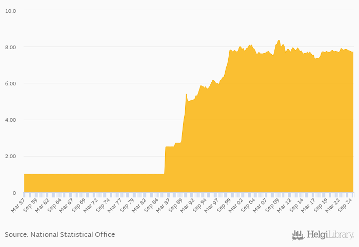 FX rate to USD at the end of period fell 0.933% yoy to 7.71 per USD in Guatemala in 1Q2025, according to the National Statistical Office. This is 0.086% more than in the previous quarter.
