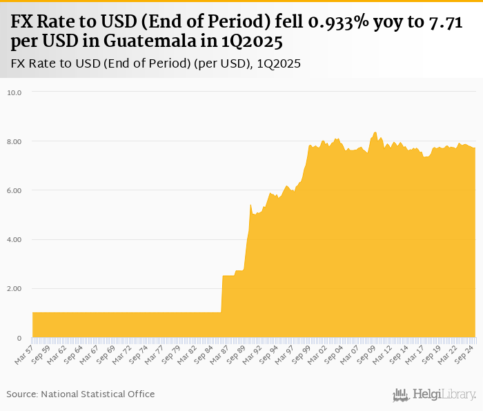 FX rate to USD at the end of period fell 0.933% yoy to 7.71 per USD in Guatemala in 1Q2025, according to the National Statistical Office. This is 0.086% more than in the previous quarter.