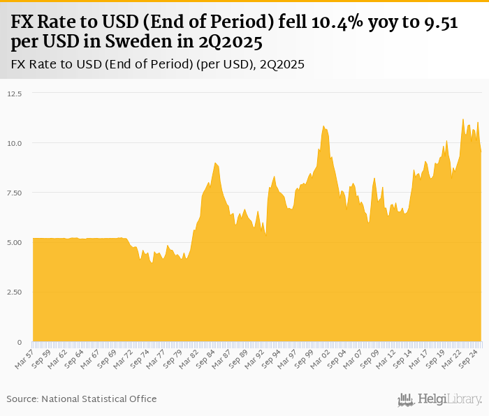 FX rate to USD at the end of period fell 10.4% yoy to 9.51 per USD in Sweden in 2Q2025, according to the National Statistical Office. This is 5.19% less than in the previous quarter.