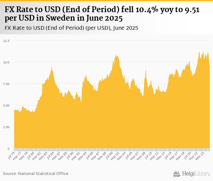 FX rate to USD at the end of period fell 10.4% yoy to 9.51 per USD in Sweden in June 2025, according to the National Statistical Office. This is 0.822% less than in the previous month.