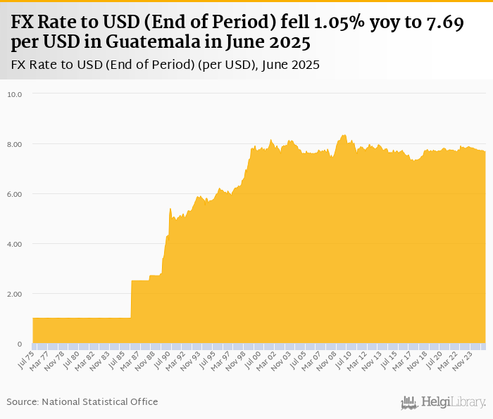FX rate to USD at the end of period fell 1.05% yoy to 7.69 per USD in Guatemala in June 2025, according to the National Statistical Office. This is 0.338% more than in the previous month.