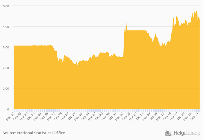 Historically, FX rate to USD at the end of period in Malaysia reached an all time high of 4.73 per USD in 1Q2024 and an all time low of 2.13 per USD in 3Q1980.
