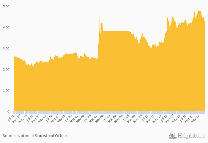 Historically, FX rate to USD at the end of period in Malaysia reached an all time high of 4.77 per USD in April 2024 and an all time low of 2.11 per USD in October 1978.